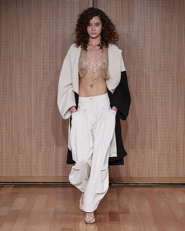 As influências do japonismo são claramente percebidas nas formas e na maneira de vestir, enfatizando a intercambiabilidade das peças. Essa abordagem contemporânea da feminilidade é enriquecida pelo uso inovador de materiais como o denim Algarve e a sarja Ubá, da Capricórnio Têxtil, ambos em 100% algodão, que transmitem um espírito experimental e criativo. Essa parceria com Capricórnio não só destaca a versatilidade do denim, mas também reforça o compromisso com a sustentabilidade, utilizando práticas responsáveis em toda a produção.