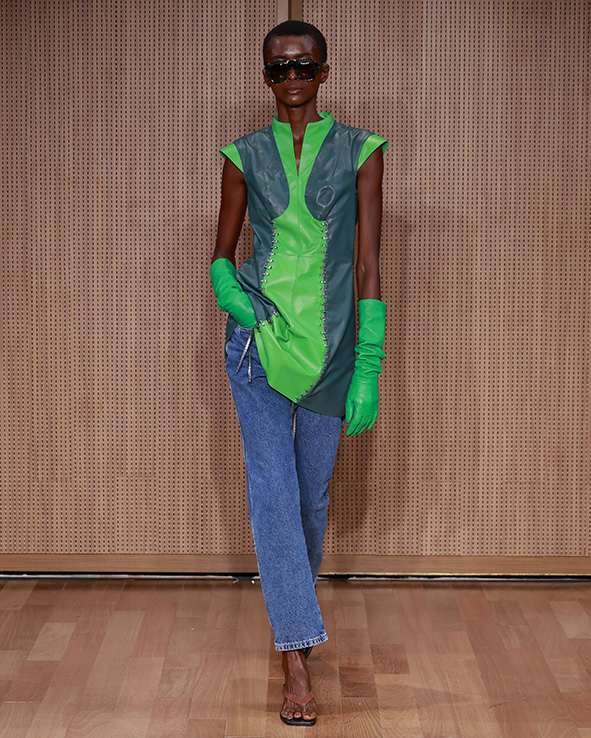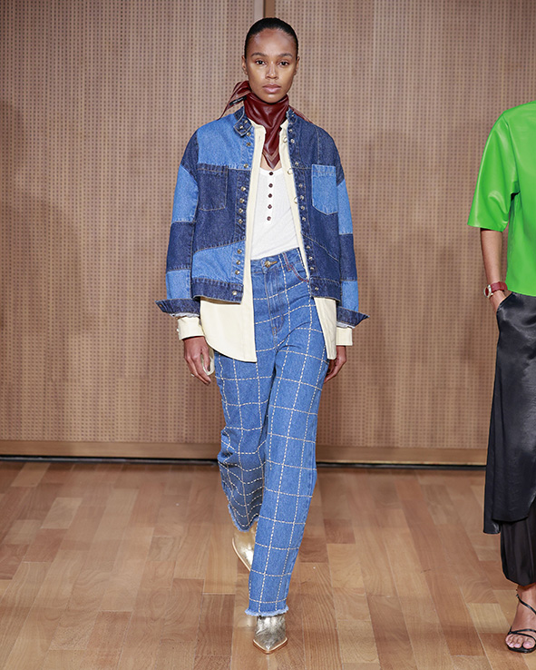 A paleta de cores, com uma rica combinação de verdes, tons terrosos e sofisticados padrões de xadrez, traz leveza e frescor ao desfile. Os acessórios, como botas, clogs e bolsas, complementam a coleção de maneira harmônica, ressaltando a força e a elegância das propostas.