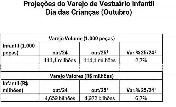 Mais do que uma data comemorativa, o Dia das Crianças se consolidou como motor de dinamização do varejo infantil, capaz de impulsionar lançamentos de coleções, estratégias promocionais e ampliar a fidelização de consumidores. Para 2025, as estimativas do IEMI – Inteligência de Mercado indicam que as vendas do setor em outubro devem alcançar R$ 4,97 bilhões, alta de 6,7% em relação ao ano anterior. Em volume, o crescimento projetado é de 2,7%, totalizando 114,1 milhões de peças de vestuário infantil.