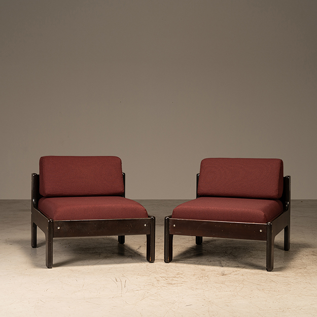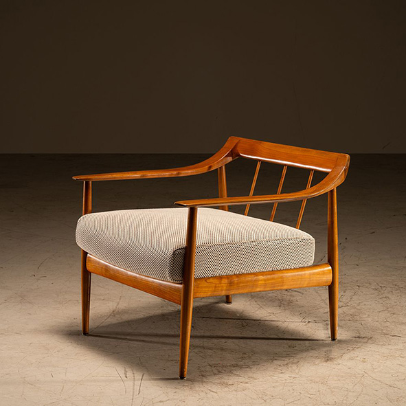 A poltrona sem braços Geraldo de Barros, com estrutura em madeira, recebe tecido encorpado da marca Fiateci, empresa com tradição desde 1891, reconhecida por soluções que aliam design e inovação no segmento de revestimentos corporativos.