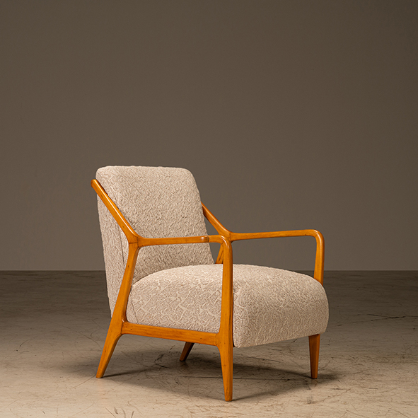 A poltrona assinada de Giuseppe Scapienlli em pau-marfim, da década de 1960, é revestida em uma malha da marca Merlintec, valorizando sua linguagem modernista.