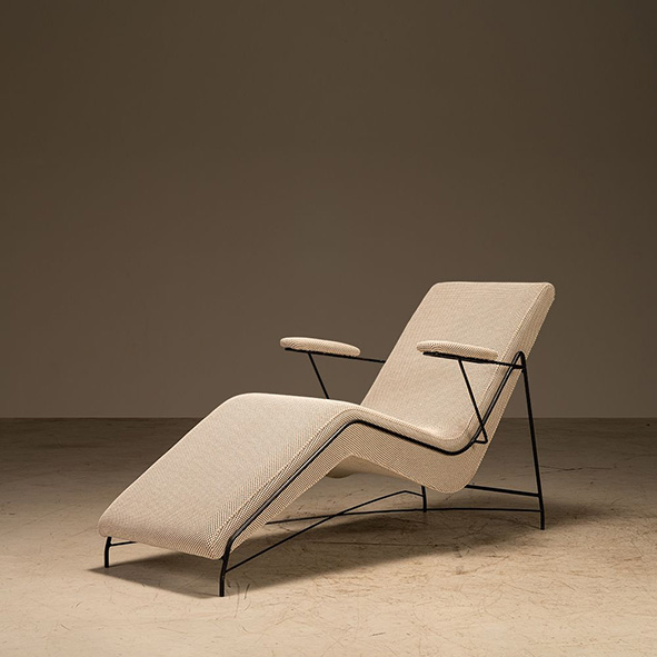 A chaise Martin Eisler de estrutura metálica recebe tecido cinza da têxtil Merlintec, ressaltando suas linhas elegantes e atemporais.
