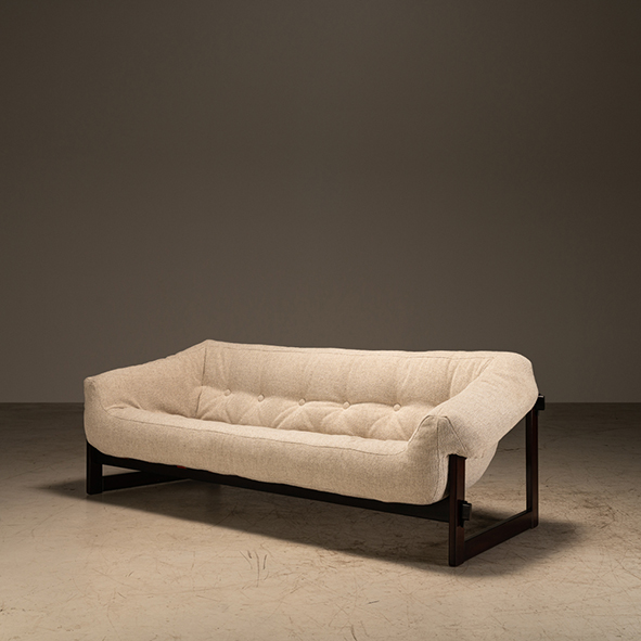 O sofá MP-79 de Percival Lafer, da década de 1970, em madeira maciça e assento em espuma injetada, é revestido com tecido da Texion, marca têxtil que equilibra tradição e contemporaneidade com olhar atento às tendências globais.