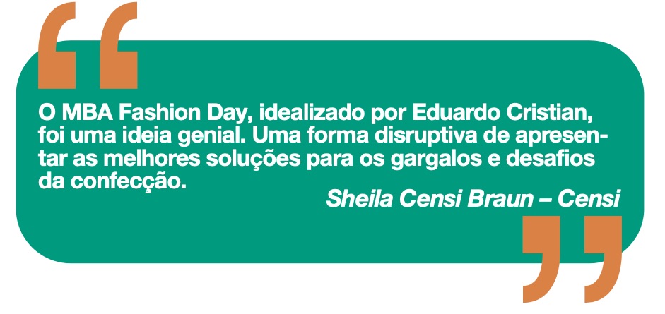 Implantar uma confecção com cerca de 300 colaboradores trabalhando no ginásio do Ibirapuera em um final de semana é, no mínimo, muito curioso, e a Censi não tinha como ficar de fora. Participamos com várias das nossas tecnologias e tivemos a oportunidade de apresentar o que há de mais eficiente para as mais de 8 mil pessoas que estiveram no evento. Sempre pode haver uma nova forma de fazer as coisas, e o MBA Fashion Day 2026 veio para comprovar”, diz Sheila Censi Braun, diretora de Mercado da Censi.