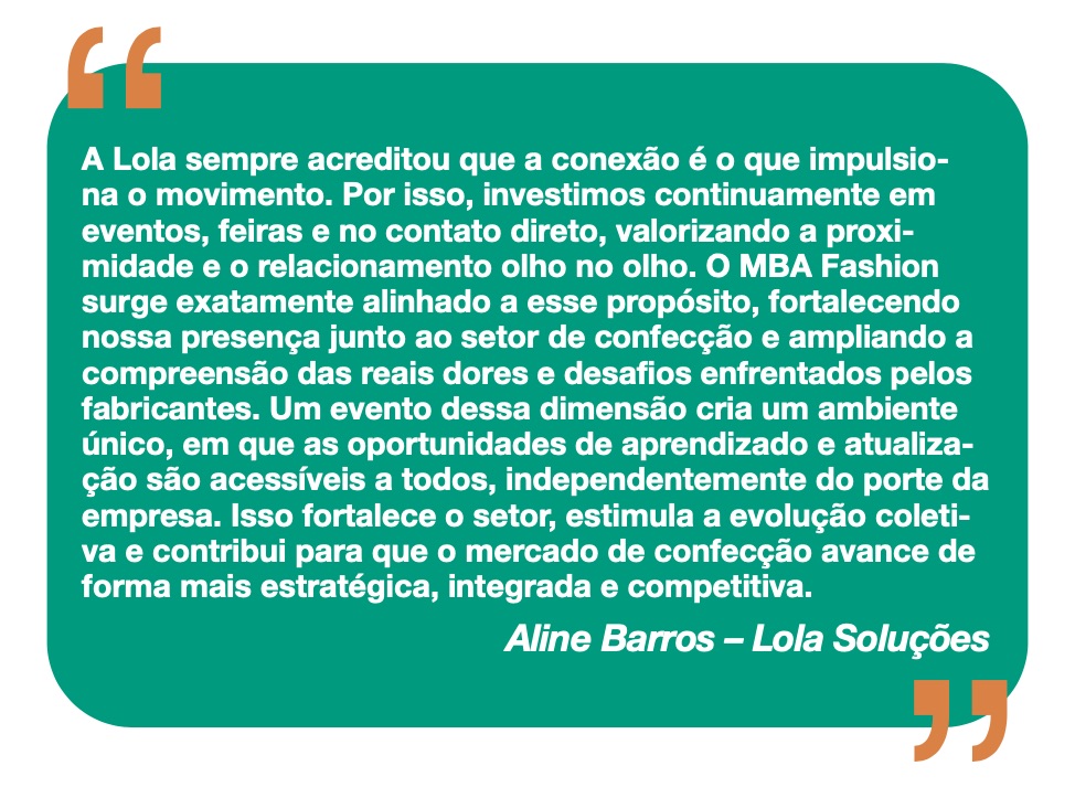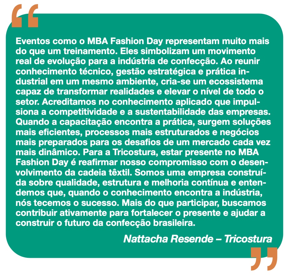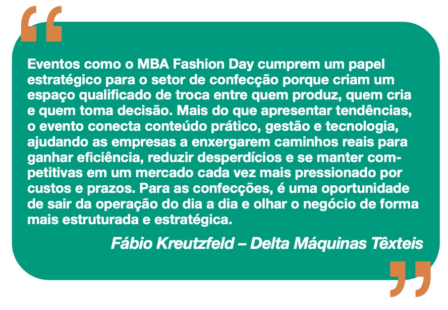 “Durante nossa participação, apresentamos equipamentos como a relaxadeira, a revisadeira e as lavadoras de amostra, explicando o papel de cada etapa no ganho de eficiência do processo produtivo. No palco, o foco não foi apenas o desempenho das máquinas, mas a forma como elas se integram ao fluxo da confecção e apoiam decisões mais estratégicas, desde o desenvolvimento até a produção em escala. Participar do MBA Fashion Day no palco foi uma experiência muito rica para a Delta, porque nos permitiu mostrar a tecnologia em funcionamento em um contexto real de confecção, exatamente como ela é aplicada no dia a dia das empresas, e estar diante de um público tão qualificado, formado por confeccionistas que vivem esses desafios diariamente, tornou a troca ainda mais relevante e reforçou a importância de unir conhecimento técnico, gestão e tecnologia para fortalecer o setor.”