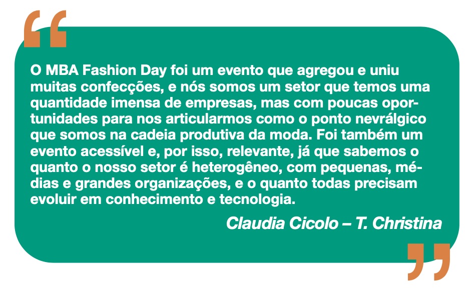 “Essa participação no MBA Fashion Day trouxe maior engajamento interno, além do contato com um conteúdo que validou alguns movimentos estratégicos que a nossa gestão está realizando na fábrica. Saímos mais alinhados e com um repertório amplo e atualizado sobre o mercado”, avalia Claudia, que completa: “O fato de terem montado uma confecção com costureiras trabalhando ao vivo no palco proporcionou a valorização de quem produz a roupa. A moda não é só sobre quem cria, é especialmente sobre quem produz. Essa valorização e visibilidade de quem fica por trás é um motor muito importante para os confeccionistas, e para nós na T.Christina.”
