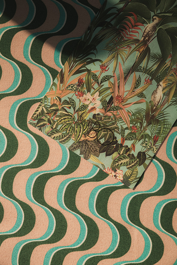 Com uma estampa exclusiva desenvolvida à mão pelo time criativo da PatBO no Brasil, o projeto celebra a tropicalidade sob uma ótica sofisticada e global. Inspirada nas formas do mar e nas nuances da natureza, a arte combina tons de verde, coral e off-white, com ilustrações de ondas, flamingos e palmeiras, um convite a mergulhar em um verão eterno. Essa estampa inédita foi aplicada em móveis e itens de décor como ombrelones, almofadas e espreguiçadeiras, criando uma atmosfera solar e refinada à beira da piscina.